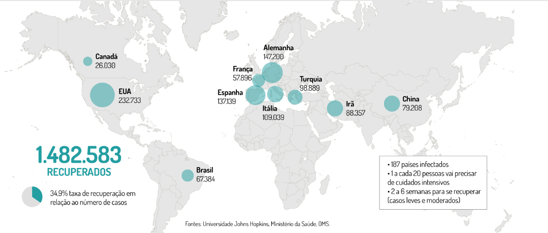 Desde que surgiu, no fim de dezembro de 2019 em Wuhan, na China, a covid-19 fez muitas vítimas (aproximadamente 290 mil no mundo todo). Mas um número muito maior de pessoas se recuperou do quadro. Segundo dados da Universidade Johns Hopkins, dos 4,2 milhões de contaminados pelo novo coronavírus (Sars-CoV-2) no mundo todo, cerca de 1,5 milhão de pessoas já se "curaram" —eram 1.482.583 recuperados quando fechamos o mapa abaixo e, às 10h20 de 13 de maio, já tínhamos 1.504.429. No Brasil, mais de 67 mil pacientes superaram a doença.