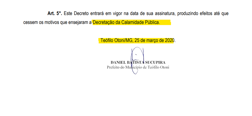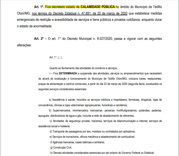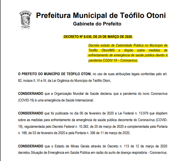 O decreto 8.030/2020 referente ao dia 25 de Março de 2020, presente no anexo no Projeto de Resolução, dispõe o fechamento das atividades comerciais não essenciais (SAIBA MAIS AQUI), e declara situação de emergência no município. Vale ressaltar que, Teófilo Otoni já registra 16 casos positivos de coronavírus e mais de 440 notificações na secretaria municipal de Saúde (MATÉRIA COMPLETA AQUI).
