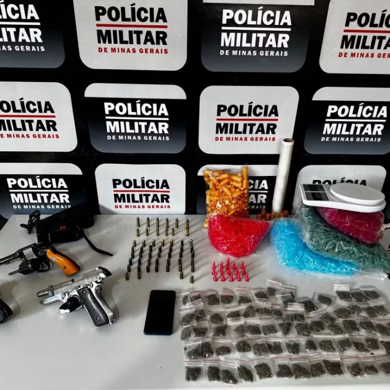 Foram apreendidos uma pistola calibre 380, uma pistola calibre 7,65 milímetros, um revólver calibre 38, 51 munições de diversos calibres, dois carregadores, um celular, 16 pinos de cocaína e uma balança de precisão.