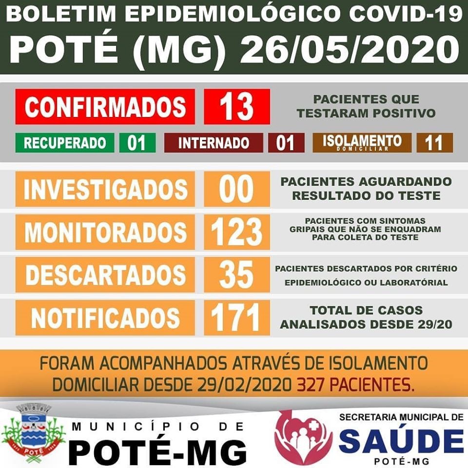 A Secretaria Municipal de Saúde de Póte confirmou na noite desta terça-feira o décimo terceiro caso de Covid-19 no município.