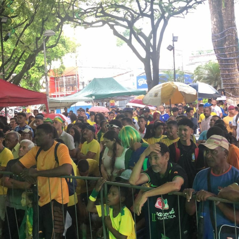 Um telão foi montado na área central para que os torcedores assistissem a estreia da seleção brasileira. Camisas do Brasil, fantasias, tinta na cara e um adereço diferente, mas necessário: o guarda-chuva, que acompanhou os torcedores teófilo-otonenses.