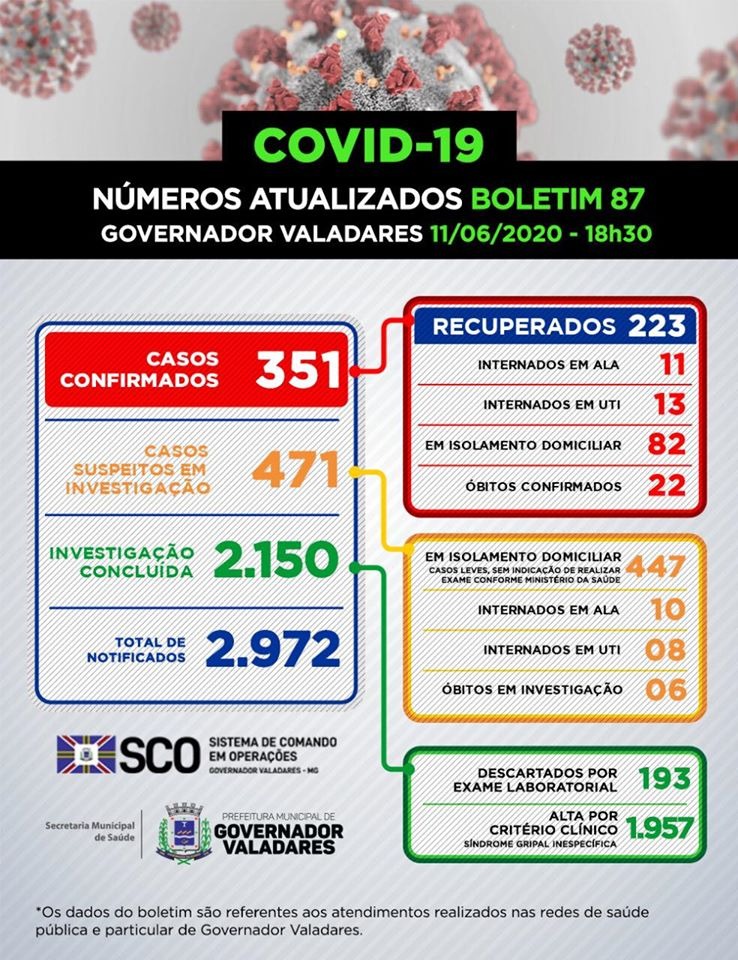 Na tarde desta quinta-feira (11), a prefeitura de Governador Valadares por meio da Secretaria municipal de Saúde, atualizou os dados do novo coronavírus na cidade.Ao todo 2.972 pacientes passaram de alguma forma no monitoramento da secretaria; podendo ser síndrome gripal leve, caso confirmado ou, suspeito com investigação em andamento - aguardando resultados de exames.