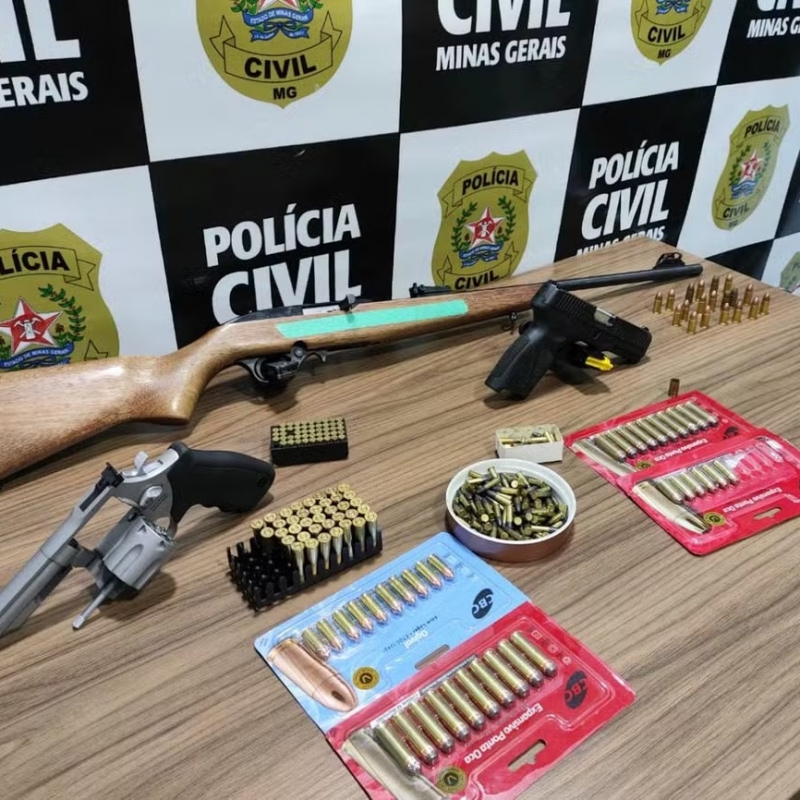 Durante cumprimento de mandado de busca e apreensão, a PC apreendeu um rifle calibre 22, uma pistola calibre 9mm e um revólver calibre 357, além de 273 munições. A ação contou com o auxílio da Polícia Militar.