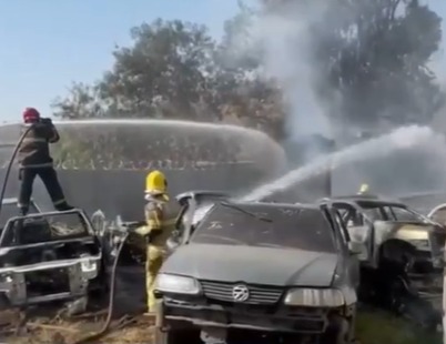 O Corpo de Bombeiros informou que o fogo começou em uma vegetação e rapidamente atingiu os veículos.