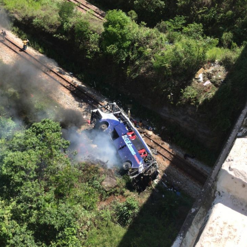 Um ônibus de turismo caiu de um viaduto de 15 metros da BR-381, na altura do KM 350, em João Monlevade, na região Central de Minas, na tarde desta sexta-feira (4). A queda ocorreu em um local conhecido como "Ponte Torta", pouco antes do posto da Polícia Rodoviária Federal (PRF). As informações iniciais passadas pelo Corpo de Bombeiros são de que o veículo era ocupado por 40 pessoas, sendo que 11 teriam morrido no acidente.