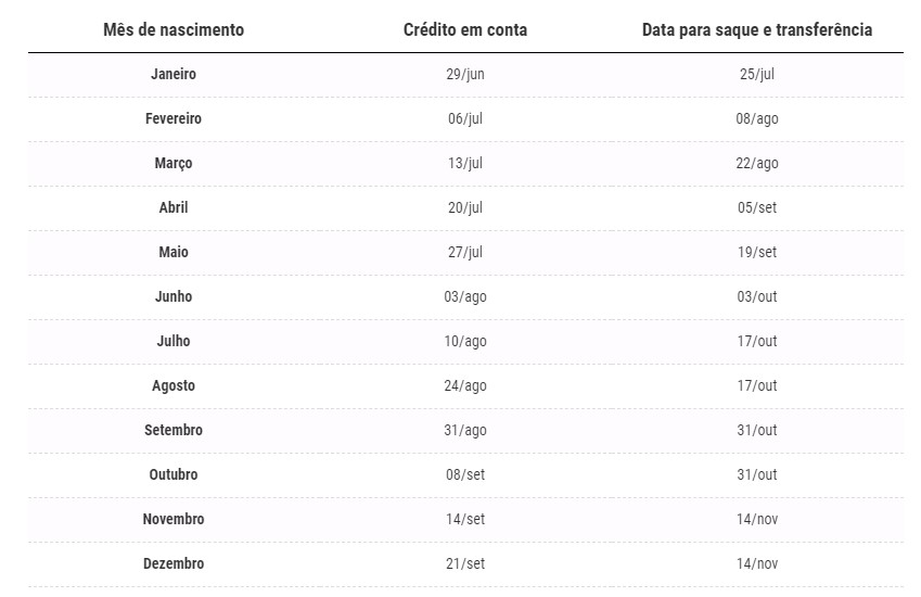 A Caixa Econômica Federal começa nesta segunda-feira (29) os primeiros pagamentos emergenciais de até R$ 1.045 do Fundo de Garantia por Tempo de Serviço (FGTS), para os nascidos em janeiro.Os pagamentos serão feitos até setembro, em um calendário escalonado que segue o mês de aniversário dos beneficiários, com um intervalo de uma semana para os meses seguintes de nascimento. Ou seja, quem nasceu em fevereiro terá o recurso liberado na próxima segunda-feira, dia 6 de julho, e assim por diante.