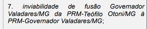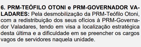 Segundo o documento, a PGR notou que seria mais viável transferir os serviços à Governador Valadares “pela desmobilização da PRM-Teófilo Otoni, com a redistribuição dos seus ofícios à PRM-Governador Valadares, tendo em visa a localização estratégica desta última e a dificuldade em se preencher os cargos vagos de servidores naquela unidade”.
