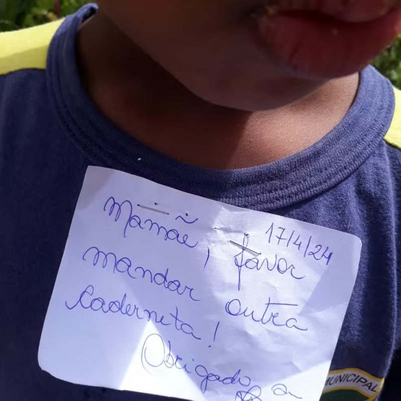 O bilhete tinha a seguinte mensagem: “Mãe, favor mandar outra caderneta! Obrigada”