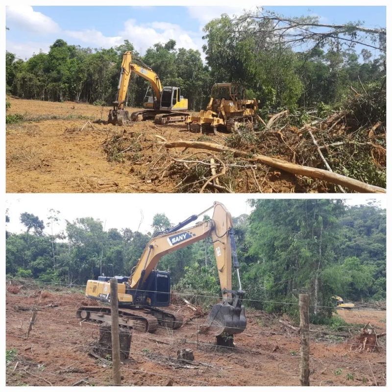 Quase um hectare foi desmatado com o uso de trator de esteiras e escavadeiras hidráulicas, deixando o solo exposto e resultando na supressão total da formação florestal. A madeira estava sendo amontoada nos fundos da área.