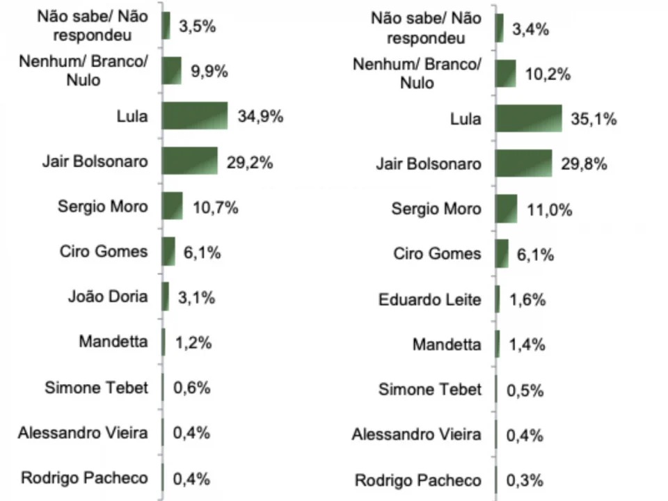 Em pesquisa espontânea, em que os nomes dos possíveis candidatos não são apresentados, Lula aparece na frente com 19,7%, seguido pelo atual chefe do Executivo, com 18,4%, e por Moro, com 2,8%. Na sequência, Ciro Gomes obteve 1,3% das citações, o governador de São Paulo, João Doria, 0,4%, o ex-ministro da Saúde Luiz Henrique Mandetta, 0,2%, e o governador do Rio Grande do Sul, Eduardo Leite, 0,2%. Os outros nomes citados somam apenas 0,5% das menções. Dos entrevistados, 45,3% não soube ou não respondeu, enquanto 11% não votaria em ninguém.