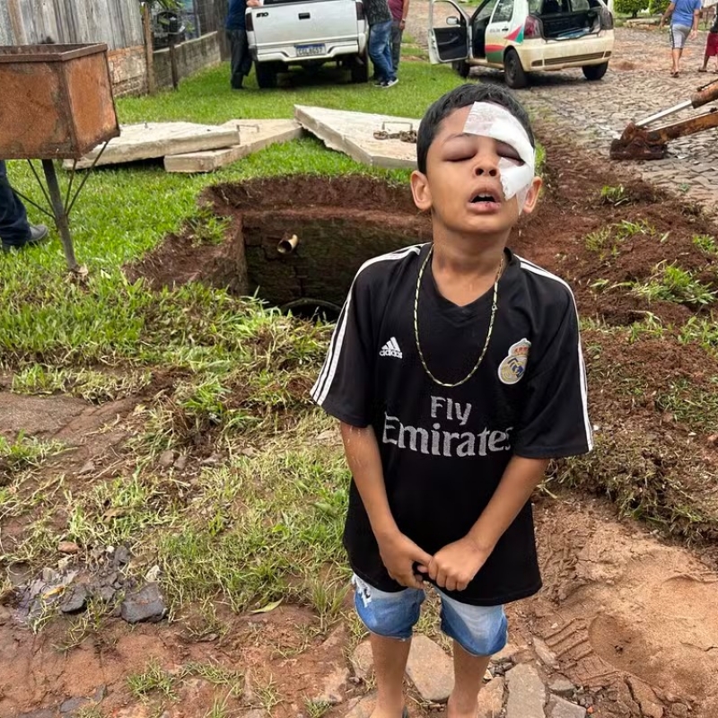 "Ele cruzou literalmente por toda a tubulação até chegar lá embaixo. A gente nunca imaginou que íamos encontrar ele novamente. Ele está comigo por Deus, eu fiquei impressionado, nunca tinha visto nada igual. No último bueiro, no fim da rua, onde tem um 'T', ele deu a sorte de sair para cima, porque ele poderia ter saído para o lado, daí a gente não conseguiria mais encontrar ele, porque a tubulação passa por baixo de um condomínio", relata, aliviado. O menino sofreu diversos ferimentos na região do rosto, foi levado pelo pai para atendimento médico no hospital da cidade e já recebeu alta. Ao todo, precisou receber 25 pontos.