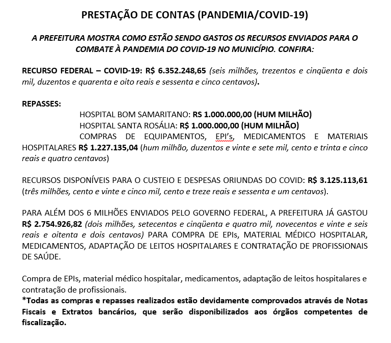 De acordo com o documento, para os hospitais Santa Rosália e Bom Samaritano, foi destinado um mesmo valor: 1 milhão de reiais. Já na compra de EPIs e materiais hospitalares: R$ 1.227.135,04 (hum milhão, duzentos e vinte e sete mil, cento e trinta e cinco reais e quatro centavos). Está no caixa da prefeitura o valor de R$ 3.125.113,61, para custeio de despesas oriundas da Covid-19, segundo o texto.