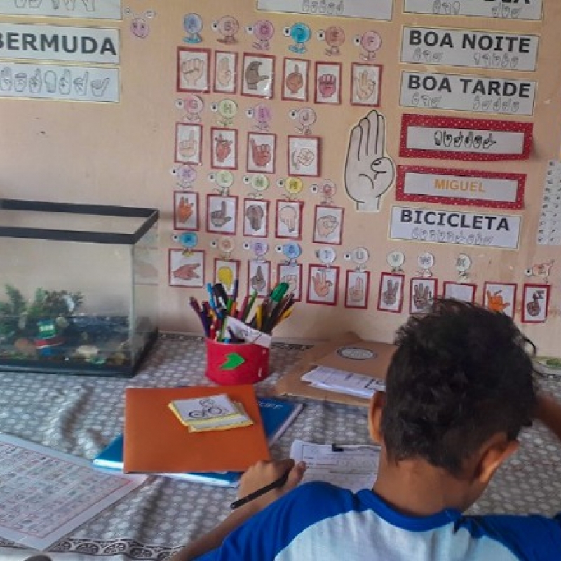 Em Teófilo Otoni, Miguel da Cruz Silva, de 8 anos, está no processo de alfabetização. Ele é surdo e foi diretamente afetado com as aulas remotas na pandemia, como relatou a mãe, Karine da Cruz Silva, em entrevista.