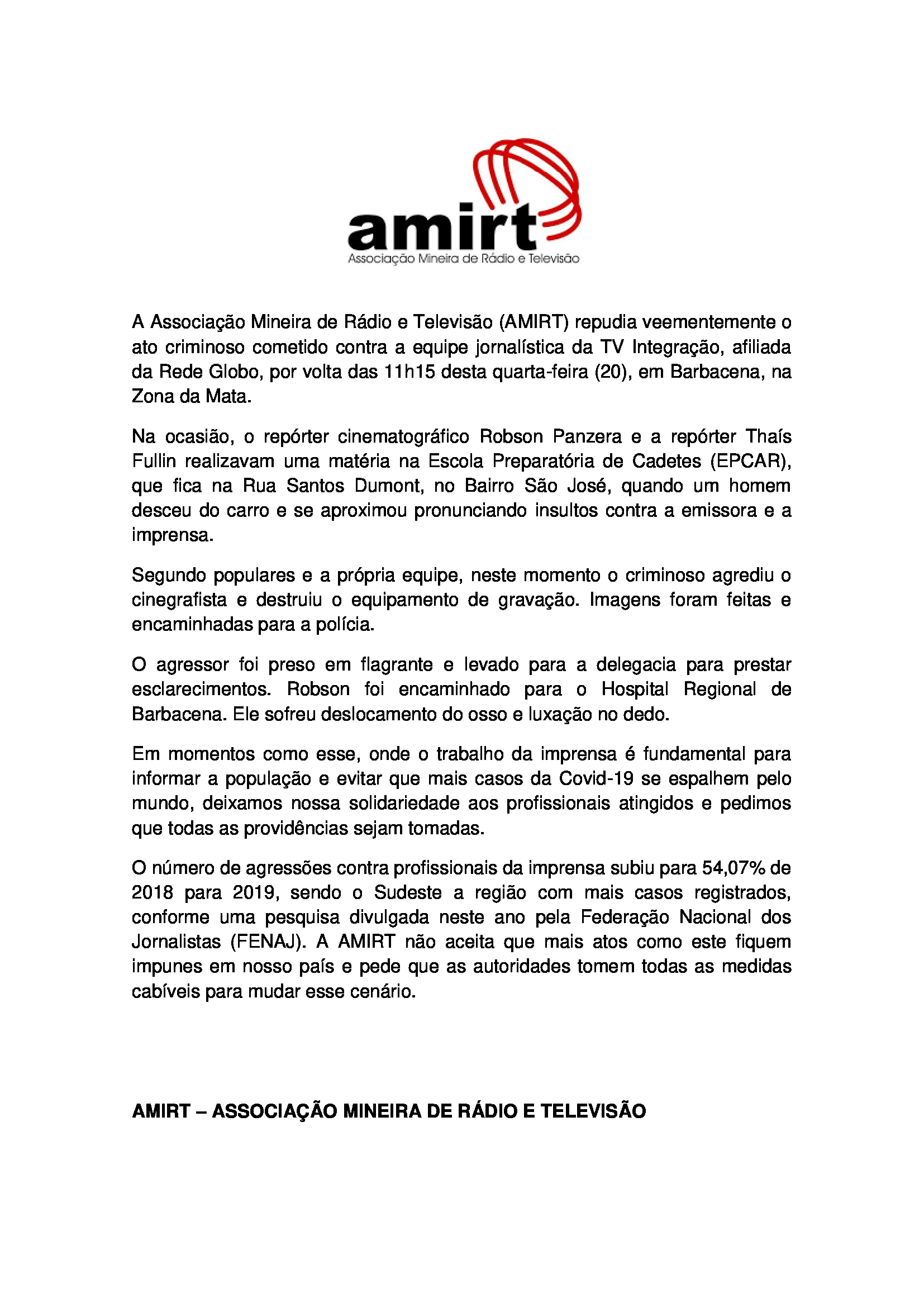 A Associação Mineira de Rádio e Televisão (AMIRT) repudia veementemente o ato criminoso cometido contra a equipe jornalística da TV Integração, afiliada da Rede Globo, por volta das 11h15 desta quarta-feira (20), em Barbacena, na Zona da Mata.