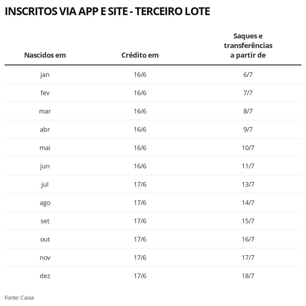 Os saques e transferências serão realizados conforme o mês de nascimento do trabalhador e vão até o dia 18 de julho. Esses trabalhadores já tiveram o dinheiro liberado na poupança social digital entre os dias 16 e 17 de junho. Veja calendário abaixo: