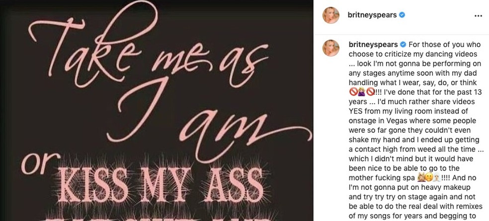No desabafo, publicado em seu perfil no Instagram, Britney disse que não vai "colocar maquiagem pesada e me esforçar no palco de novo e não poder fazer as negociações reais dos remixes das minhas músicas por anos e implorar para colocar minhas novas músicas no meu show para os meus fãs. Então, eu renuncio".