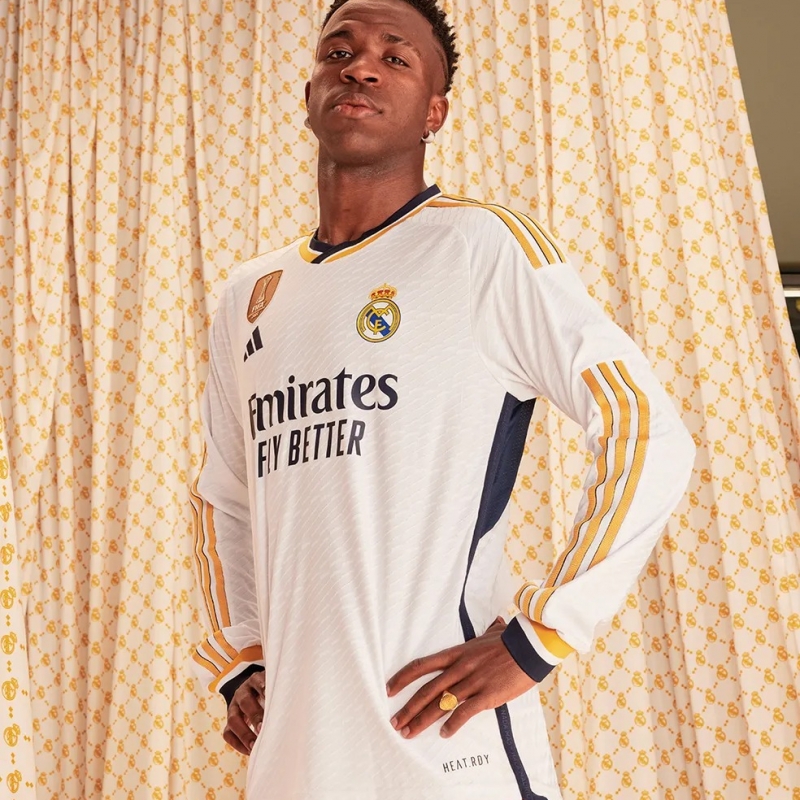 Na tradicional cor branca, a camisa tem gola com corte em V e detalhes em azul marinho e dourado. Na nuca, fica em destaque a saudação “¡Hala Madrid!”. Outros atletas do Real Madrid, como Lucas Vázquez, Toni Kroos, Federico Valverde, Ferland Mendy, Éder Militão e Courtois também fizeram parte da campanha de lançamento.