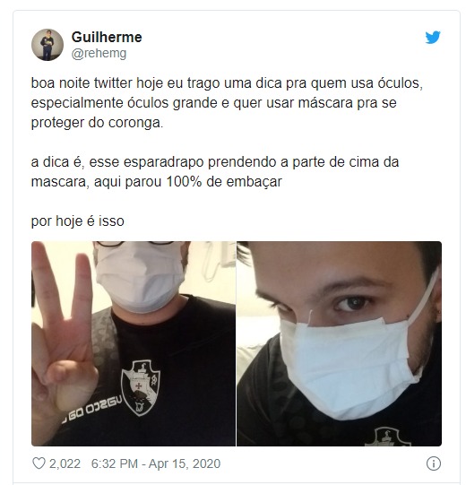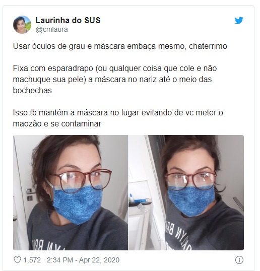 Além disso, se os óculos estão embaçando, sinal que o ar expirado está escapando por ali, e portanto o ar inspirado, que pode estar contaminado, também entrará por ali sem passar pela máscara.