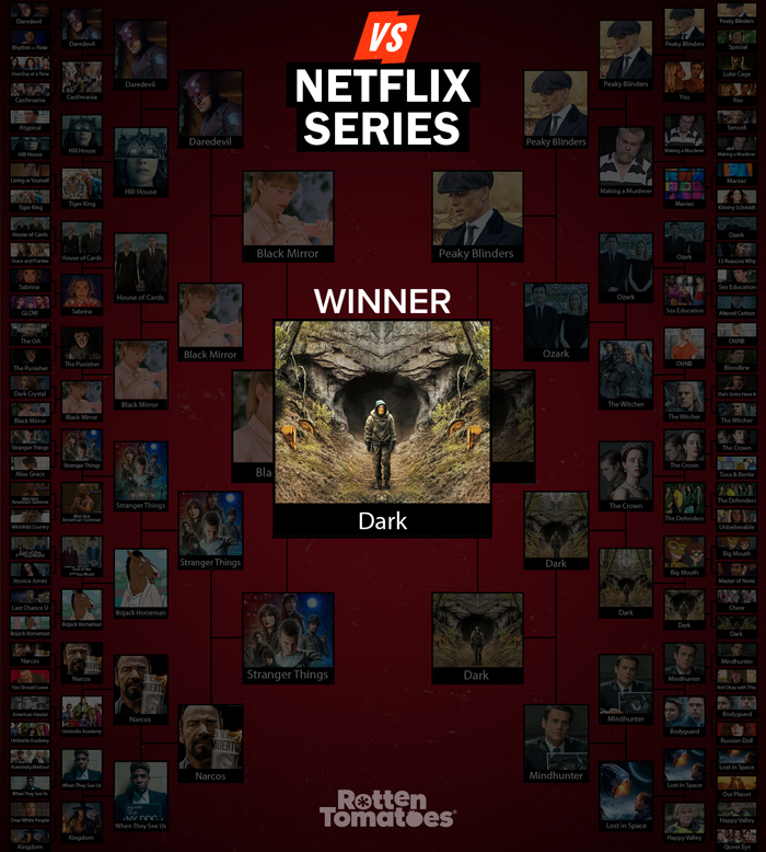 Cada etapa da votação colocou dois títulos originais da Netflix para se enfrentar. Dark derrotou títulos aclamados pelo público, como The Crown, Mindhunter e Peaky Blinders. Stranger Things chegou à semifinal da votação, mas o público escolheu Black Mirror para a final, com 64% dos votos. “Com o impacto cultural, era de se imaginar que [Black Mirror] seria um desafio maior para Dark”, publicou o Rotten Tomatoes.