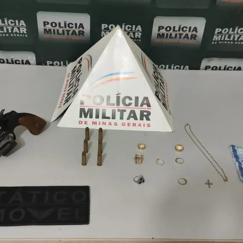 Os policiais encontraram o homem com a arma na cintura, os materiais roubados no bolso da bermuda e ele acabou confessando o crime.