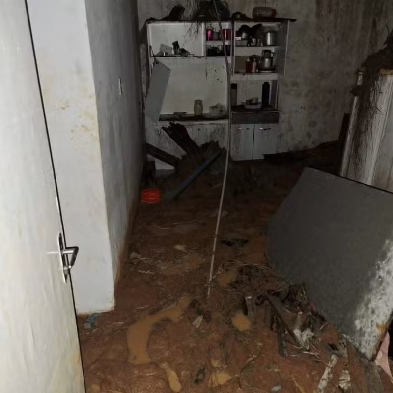 O deslizamento derrubou parte da residência, soterrando carros e motos. Uma pessoa ficou ferida e foi socorrida.