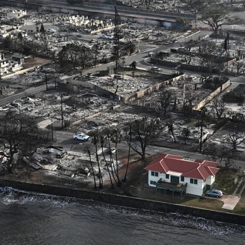 Imóvel de madeira de 100 anos foi reformada recentemente, mas não era resistente ao fogo, dizem proprietários. A imagem de uma casa que aparece intacta em meio ao cenário de destruição causado pelos incêndios no Havaí viralizou.
