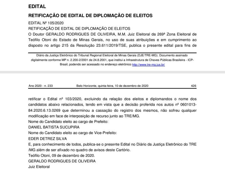O Diário da Justiça Eletrônico de Minas Gerais publicou na edição desta quinta-feira (10), uma retificação de edital de diplomação de eleitos, onde o Juíz Eleitoral da 269° Zona Eleitoral de Teófilo Otoni, Dr Geraldo Rodrigues de Oliveira excluiu o nome dos candidatos da chapa "Avança Mais", Daniel Sucupira (PT) como candidato a prefeito eleito e Elder Detrez (DEM) candidato vice-prefeito eleito.