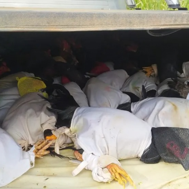 Duas pessoas foram presas pelo crime de maus-tratos e multados em mais de R$ 125 mil. Animais estavam na carroceria de uma caminhonete, que passava por São João del Rei. Policiais militares de meio ambiente resgataram mais de 40 galos que seriam vendidos para rinhas em São João del Rei, no Campo das Vertentes. Os animais foram encontrados amarrados e com a cabeça coberta na caçamba de uma caminhonete. Um idoso, de 69 anos, e um homem, de 45, foram presos e multados em mais de R$ 125 mil. A abordagem ocorreu, na tarde de quarta-feira (16), na BR-265. Segundo informações da Polícia Militar de Meio Ambiente (PMMA), os galos estavam apertados, sem espaço para se mexerem e deitados sobre as próprias fezes. Ainda havia falta de ar e luz na carroceria do veículo.