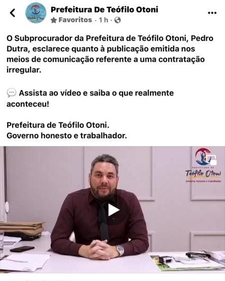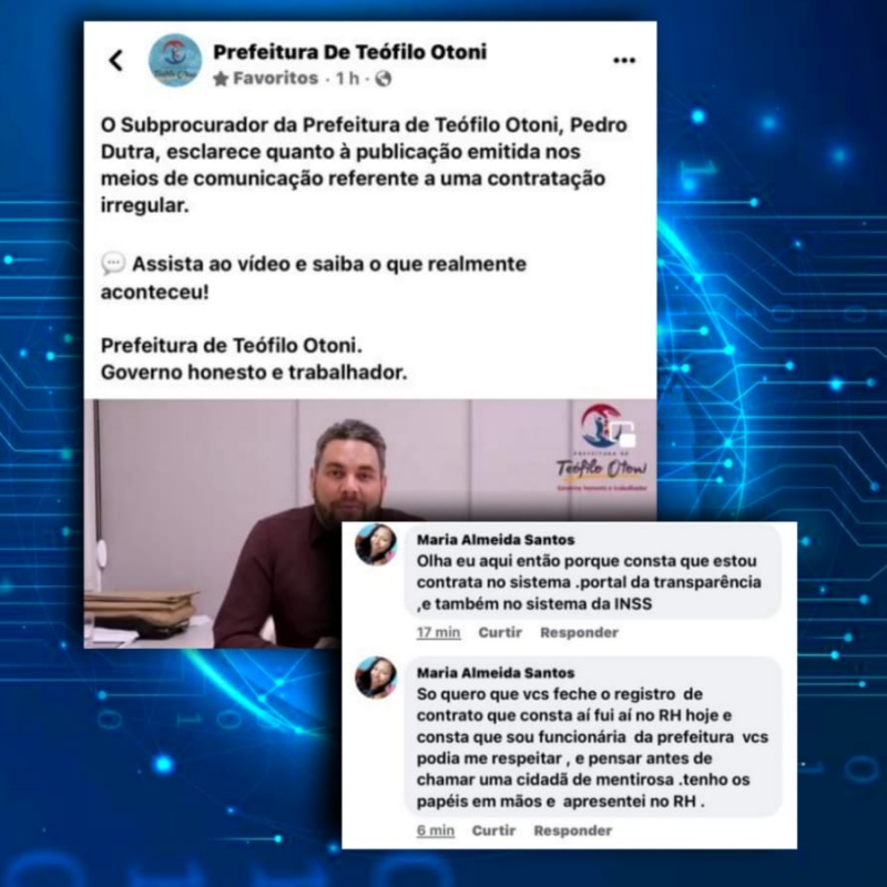 Na publicação no Facebook aparece o Subprocurador Geral do Município, Pedro Dutra, dando uma resposta à reportagem publicada ontem, de que mostrou, que em março desse ano, Maria de Almeida Santos participou das inscrições do mutirão de limpeza realizado pela Prefeitura de Teófilo Otoni, não foi chamada e nem prestou serviços aos município, e que ao entrar com um pedido de auxílio invalidez no INSS – Instituto Nacional de Seguro Social, descobriu que está empregada na prefeitura, conforme o portal CNIS – Cadastro Nacional de Informações Sociais Relações Previdenciárias. O portal da Transparência apresenta um contracheque, onde Maria teria recebido mais de R$ 1.500,00. A moradora desconhece a contratação e diz que não recebeu o valor.