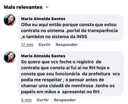 “Só quero que vcs fechem o registro de contrato que consta aí, fui no RH hoje e consta que sou funcionária da prefeitura. Vcs podiam me respeitar, e pensar antes de chamar uma cidadã de mentirosa, tenho os papéis em mãos e apresentei no RH”, escreveu Maria no comentário, que posteriormente foi apagado.