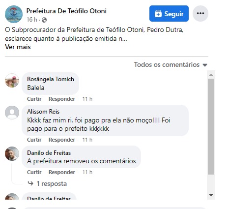 Após a reportagem da Rádio 98, que revelou com exclusividade a contratação de uma funcionária fantasma, o perfil oficial do Município de Teófilo Otoni na plataforma online Facebook, apagou comentários que continham mensagens críticas. Algo similar aconteceu no Instagram, onde os comentários foram bloqueados.