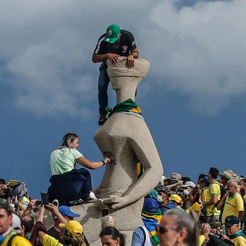Debora Rodrigues dos Santos, é apontada como a mulher flagrada picando a estátua da Justiça, uma obra de arte. A frase é uma referência à resposta que o ministro Luís Roberto Barroso, do STF, deu após ser hostilizado por bolsonaristas.