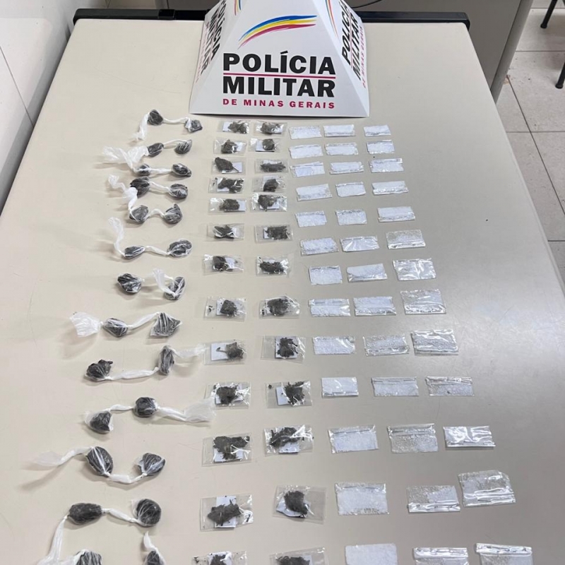 Os policiais, então, realizaram buscas nas redondezas, onde os infratores costumavam permanecer, e encontraram uma sacola plástica escondida sob uma folha de metal. Dentro dela, foram localizadas 26 buchas de maconha comum, 26 buchas da variedade conhecida como SKUNK, e 39 papelotes de cocaína.