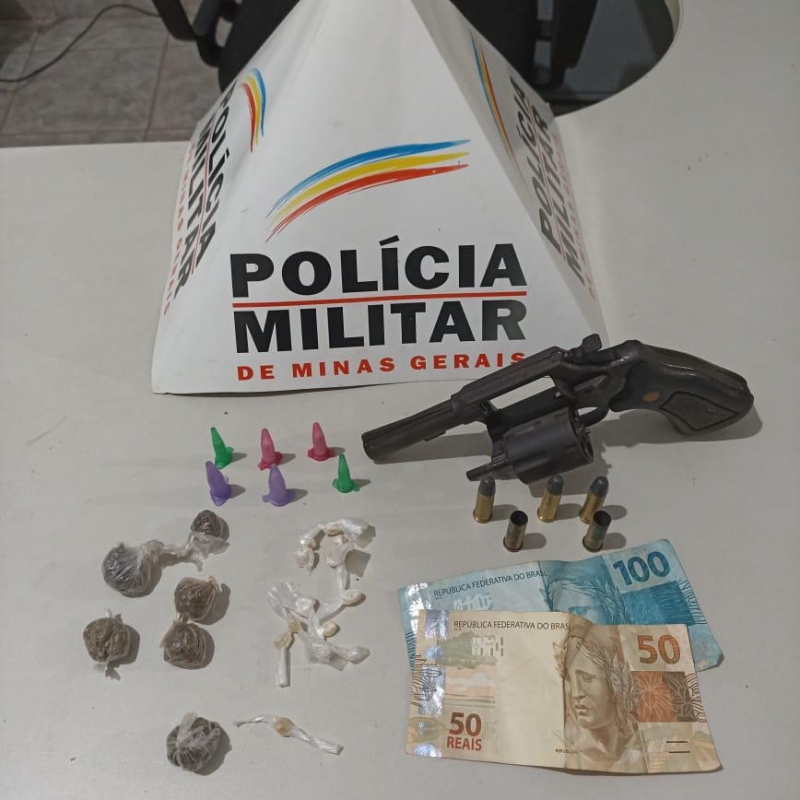 No local do confronto, foram encontrados um revólver calibre 38, contendo 3 cartuchos íntegros e 2 deflagrados, além de substâncias entorpecentes e uma quantia em dinheiro.