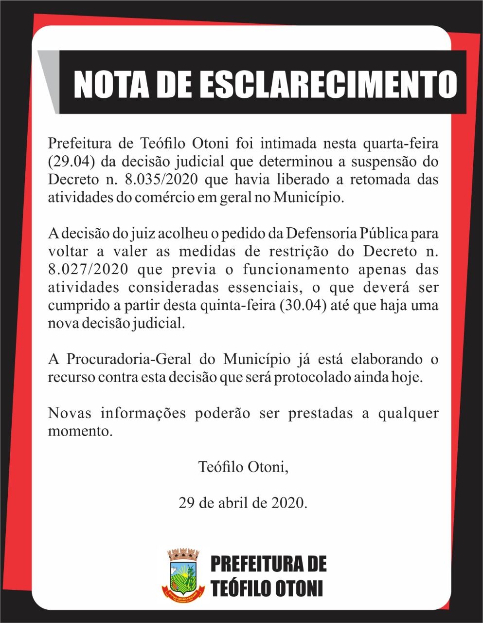 Com exclusividade o jornalismo da 98 recebeu de fontes seguras, a informação que, a prefeitura já recebeu a notificação sobre o fechamento do comércio - notificação do Tribunal de Justiça do Estado, em que a liminar Ação Civil Pública proposta pela Defensoria Pública de Minas gerais - Unidade de Teófilo Otoni pela qual o juiz de direito da 2a vara Cível determinou a suspensão do decreto 8035/2020 e por consequência manteve suspensa a atividade comercial na manhã desta terça-feira (28) por meio do Juíz de Justiça, Emerson Chaves Motta.