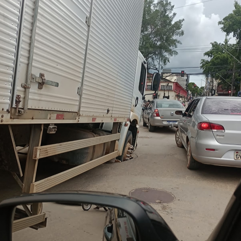 BURACO NA PISTA ? | O asfalto da avenida Luís Boali Porto Salman, no centro de Teófilo Otoni cedeu "engolindo" o pneu de um caminhão. O fato aconteceu na tarde desta quinta-feira (01/12).
