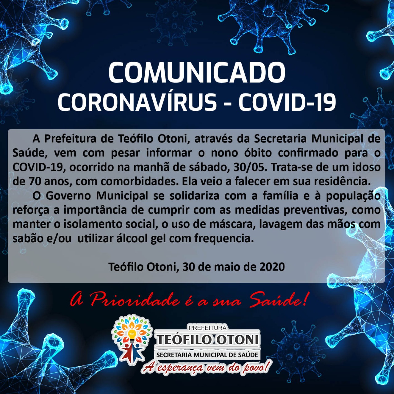 URGENTE – Na manhã deste sábado (30), a secretaria municipal de Saúde de Teófilo Otoni confirmou o nono óbito causado pelo novo coronavírus.