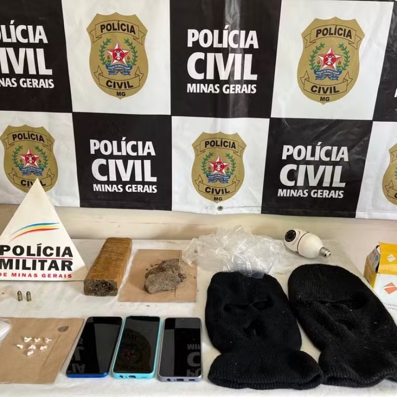 Os policiais apreenderam uma barra e porções de maconha, duas munições de pistola 380, três aparelhos celulares, duas toucas ninjas e vários sacos plásticos usados para embalagem de drogas.
