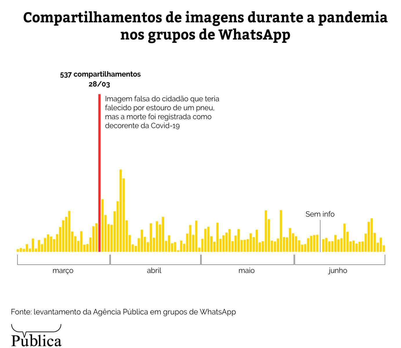 A foto foi enviada nada menos que 874 vezes a 152 grupos diferentes, sendo 80% delas entre os dias 3 e 5 de abril. Ela vinha acompanhada de diferentes versões sobre os acontecimentos – e nenhuma delas era verdadeira.