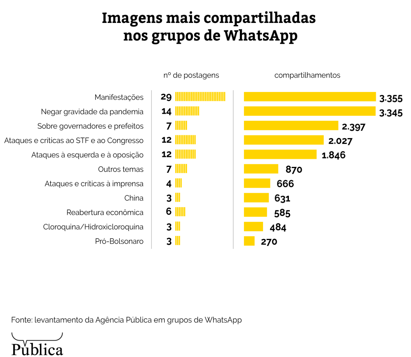 A reportagem analisou as cem imagens mais compartilhadas entre 1o de março de 2020 e 30 de junho de 2020 na base de grupos de WhatsApp do projeto Eleições sem Fake, do Departamento de Ciência da Computação da Universidade Federal de Minas Gerais (UFMG). A amostra inclui 522 grupos públicos de WhatsApp relacionados à política – de diferentes espectros – e mais de 18 mil usuários ativos.