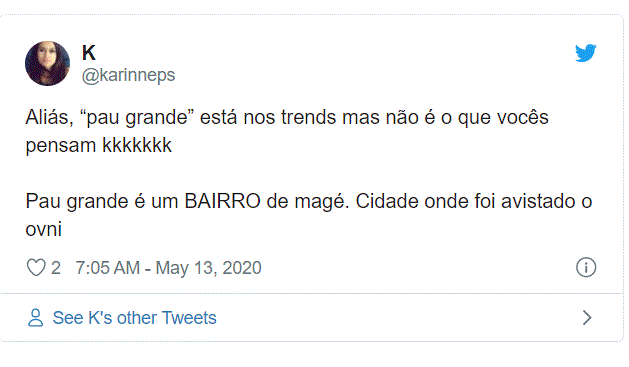 Quem acessou o Twitter na manhã desta quarta-feira (13), se deparou com "Pau Grande" entre os assuntos mais comentados, sendo este um sub-bairro de Vila Inhomirim do município de Magé, região metropolitana do Rio de Janeiro.