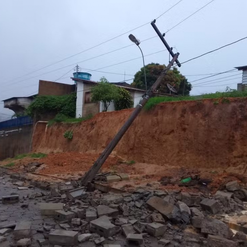 Um muro desabou sobre um poste de energia elétrica no bairro Santa Helena, deixando moradores sem luz.